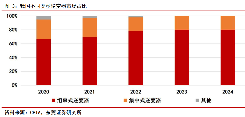 我国光伏逆变器市场主要以集中式逆变器和组串式逆变器为主, 微型和其他类型逆变器占比极小。 根据 CPIA, 2024 年我国仍以组串式逆变器为主, 组串式逆变器的市场占有率约 80%, 其次为集中式逆变器, 市场占有率约 20%。