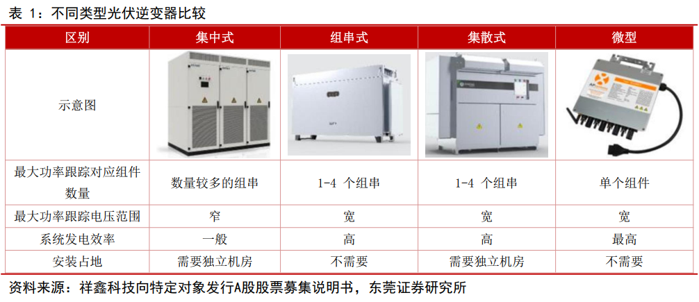 根据不同功率, 光伏逆变器可分为集中式逆变器、 组串式逆变器、 集散式逆变器及微型逆变器, 主要区别在于逆变器单体容量以及直接与其连接的光伏组件数量的不同,同时也具有不同的下游应用场景。