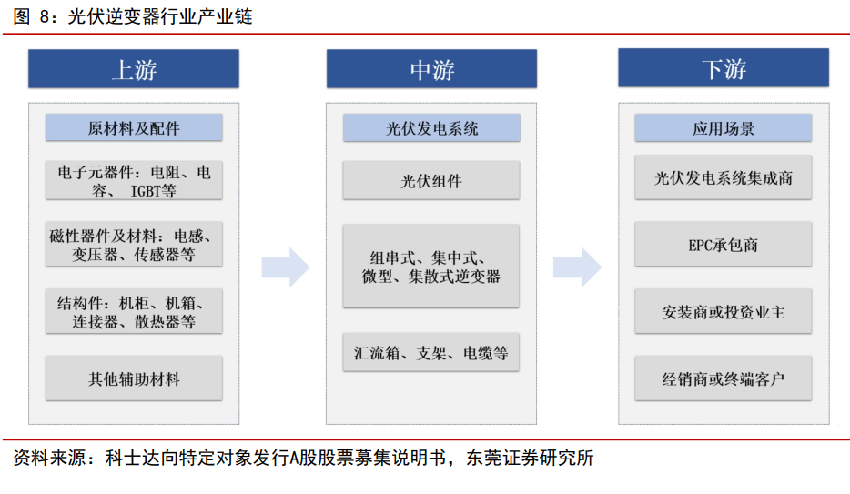 采用 IGBT 器件+SiC 器件设计方案的逆变器, 大量使用 SiC(碳化硅) 器件, 将 SiC高频化技术应用到产品中, 可以进一步减小产品体积、 重量, 优化性能指标。 碳化硅器件具有损耗小且不易受到电流、 温度影响的特点, 能够有效提升产品效率等性能指标。光伏逆变器产业链中游主要包括光伏组件厂家、 逆变器厂家和光伏配件厂家等。 下游主要是光伏发电系统集成商、 EPC 承包商、 安装商和投资业主等。