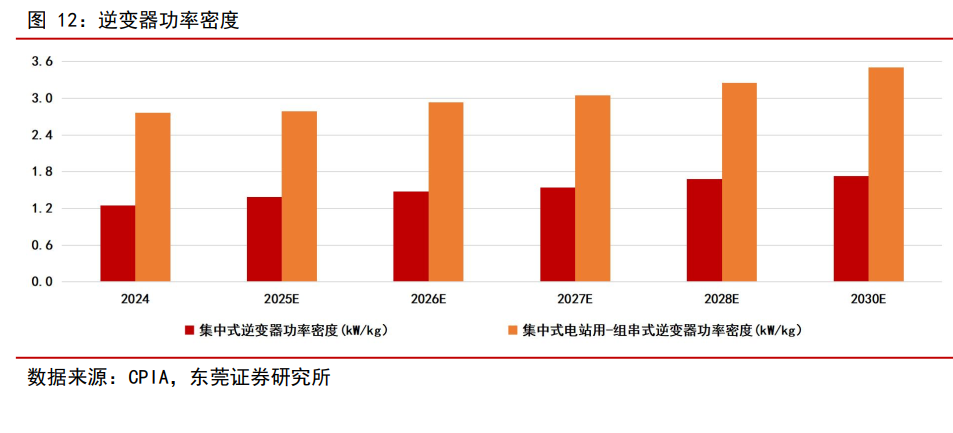 逆变器功率密度是指逆变器额定功率与逆变器设备自身的重量比值。 2024 年集中式逆变器功率密度为 1.25kW/kg, 较 2023 年提高 0.05kW/kg; 集中式电站用-组串式逆变器功率密度为 2.76kW/kg, 较 2023 年提高 0.13kW/kg。 随着电力电子器件的升级以及逆变器生产厂家在逆变器结构上的创新, 未来逆变器的功率密度有望进一步提升。