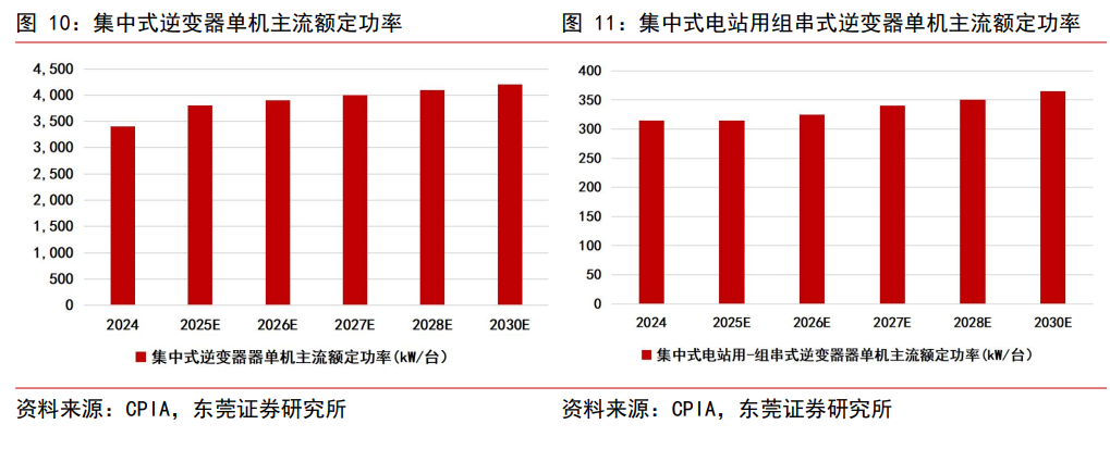 随着光伏组件朝着高功率化方向发展, 为了达到 LCOE 成本最优以及与光伏组件相匹配等因素, 逆变器功率也呈逐步提升趋势。 至 2030 年, 集中式逆变器单台主流功率均值有望达到 4200kW/台, 集中式电站用-组串式逆变器有望达到 365kW/台。