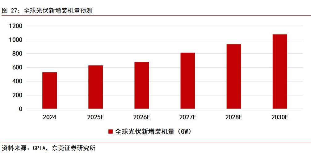 根据 CPIA, 在乐观情景下, 2025 年全球光伏新增装机量有望达 630GW, 同比增长18.9%。 至 2030 年, 全球光伏新增装机量有望达到 1078GW, 2025—2030 年全球光伏年均新增装机量仍有较大增长空间。