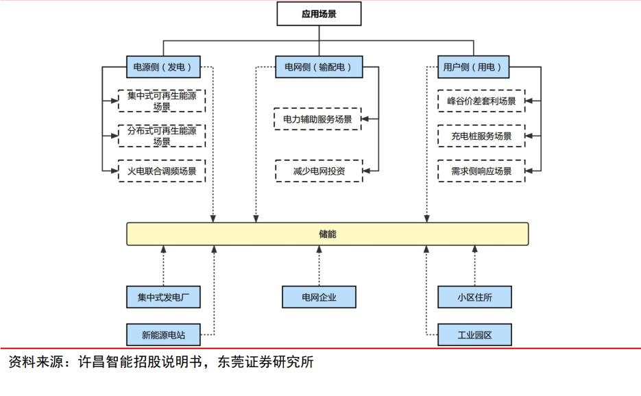 储能技术在电力系统应用场景包括发电侧、 电网侧以及用电侧应用。 发电侧主要用于可再生能源发电厂以及传统电站, 既能改善可再生能源发电特性, 平抑发电波动, 减少弃风弃光, 提高电站发电质量和发电安全水平, 又能辅助传统电站动态运行; 电网侧主要用于电力辅助服务, 通过调频、 调幅等措施保障电网稳定运行; 用电侧主要应用于( 家庭) 户用储能和工商业储能。