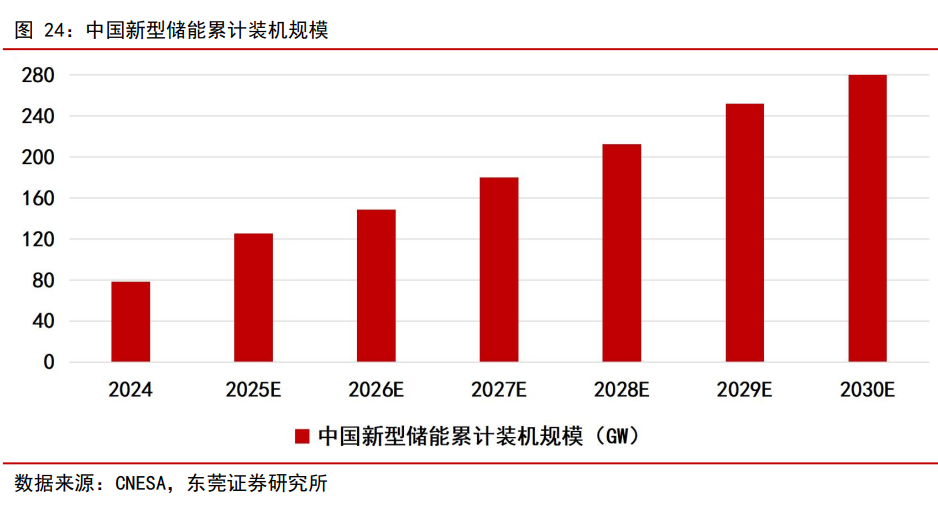 根据 CESA 储能应用分会数据库统计, 2025 年 1—9 月, 中国储能新增出海订单/合作总规模达 214.7GWh, 同比增长 131.75%, 其中, 9 月海外订单超 30GWh。 目前, 中国储能电芯与电池系统规模化带来的单位成本下降, 使中国厂商在海外多个地区具有显著落地成本优势, 能够以更低的 LCOE 中标大型项目。 预计到 2030 年底, 全球累计储能装机规模将达 730GW/1950GWh 左右, 未来全球储能市场仍将保持强劲增长态势。2025—2027 年, 在《新型储能规模化建设专项行动方案(2025—2027 年) 》 等国内政策的推动下, 新型储能装机规模将呈高速增长态势。 随着储能技术的持续进步、 投资成本的不断下降、 商业模式的逐步成熟, 未来中国新型储能装机规模仍将保持增长趋势。 根据 CNESA, 2024 年, 中国新型储能累计装机规模为 78.3GW, 2025 年有望达到125.7GW, 同比增长 60.5%。 到 2030 年, 中国新型储能累计装机规模有望达到 291.2GW,2024—2030 年年均复合增速约 24.5%。