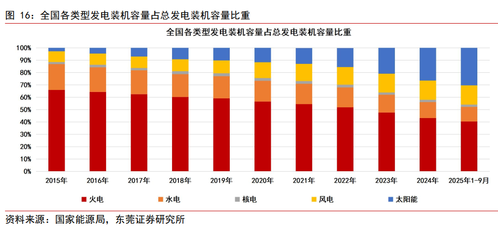 在全国能源结构转型的背景下, 风电、 太阳能的发电装机容量比重逐年提升, 火电和水电的发电装机容量比重呈下降趋势。 截至 2025 年 9 月, 全国发电装机容量约 37.17亿千瓦, 较去年同期增长 17.5%。 其中, 太阳能、 风电的发电装机容量合计占总发电装机容量的比重达 46.0%, 较去年同期提高 6.3 个百分点, 火电和水电的装机比重分别降至 40.4%和 11.9%。