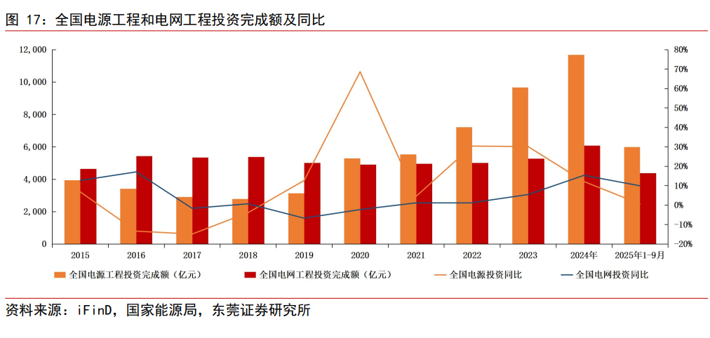 2020—2024 年, 全国电源工程投资完成额呈显著增长态势, 期间全国电源工程投资完成额均超过了全国电网工程投资完成额。 随着国内新能源发电装机容量快速提升, 新能源发电消纳的压力也随之加大。 2021—2024 年, 全国电网工程投资完成额同比增速逐年提升, 2025 年 1—9 月全国电网工程投资完成额达 4383 亿元, 同比增长 9.9%, 保持同比较快增长趋势。 全国电网建设在特高压、 省级电网等领域的持续投入, 将为国内能源转型和新能源发电消纳提供强力支撑。