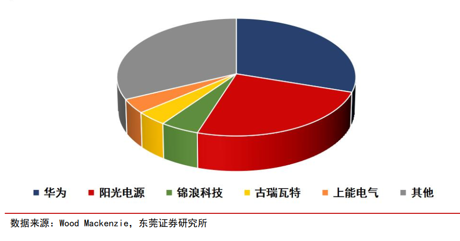 根据 Wood Mackenzie, 2024 年, 全球光伏逆变器出货量达到 589GW, 全球前五大逆变器厂商出货量占全球逆变器出货量比重近七成, 全球出货量前十的厂商中有九家中国企业, 华为及阳光电源连续十年稳居全球前两位, 两者合计占据全球逆变器约 55%市场份额。