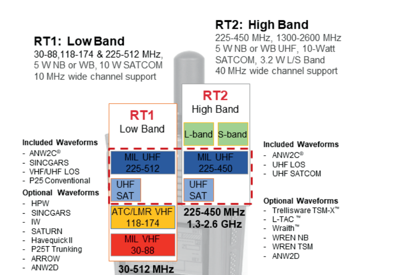 R/T1: 覆盖战术窄带核心频段 (VHF/UHF) + 军用卫星通信 (MUOS/UHF SATCOM),并集成 全频段电子战感知 (SBTW/SA 30-2600MHz)。MUOS美军新一代窄带军用卫星通信系统