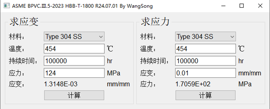 1)本计算程序为高温蠕变-疲劳分析和评定方法所用的平均等时应力-应变曲线的查询计算,适用于ASME Code Case 2843、ASME BPVC.Ⅲ.5及GB/T4732.5附录A中方法1(三种方法是一样的,GB/T4732.5引用的是Code Case 2843中的方法,而Code Case 2843引用的则是ASME BPVC.Ⅲ.5中的方法)。