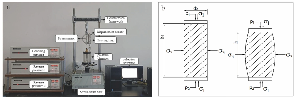 Fig.2 SLB-1 stress–strain-controlled triaxial shear permeability tester and test principle diagram