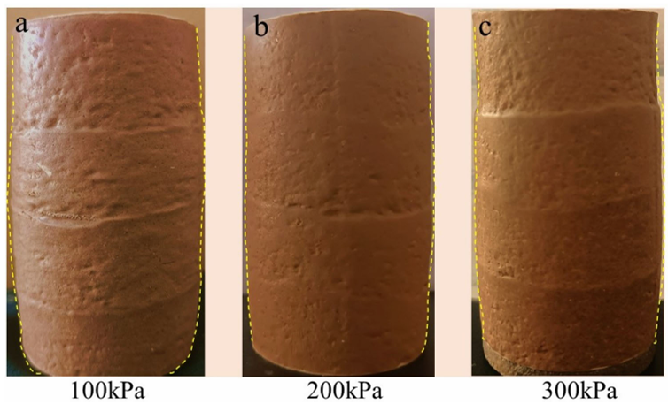 Fig.7 Post-testing morphology of specimen with ρdmin=1.54 g/cm3 after triaxial shear-seepage testing