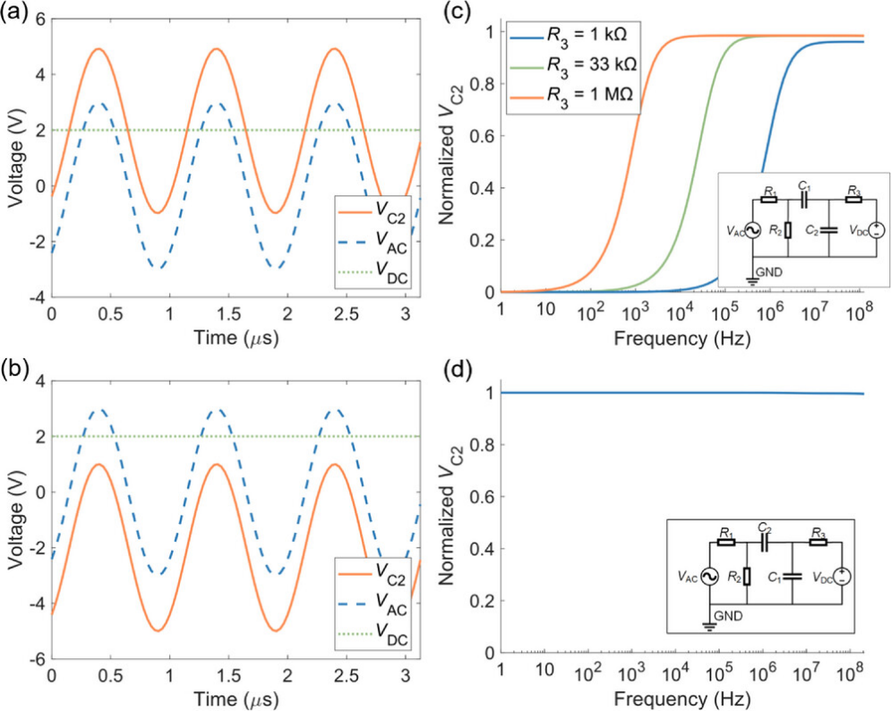 图3 本文提出调制器的等效电路分析。a,b)当同时将VDC和VAC信号施加到调制器上时,VC2的时序图。c,d)调制电压VC2的频率响应,已归一化到VAC。插图显示了相应的等效电路。这里,a,c)是s-sep结构,b,d)是g-sep结构。