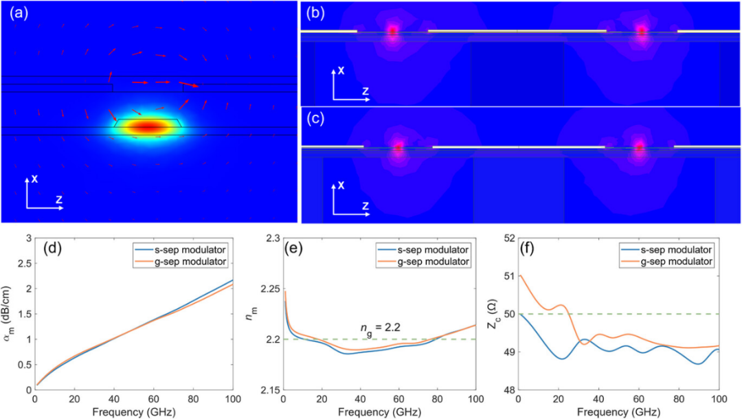 基于有限元算法的多物理场求解器被用于模拟器件在高频下的电学性能及其光学模态特性,如图4a所示。高频下,微波信号可轻易通过C1耦合,因此可以设想C1不会影响最终的电学性能。如图4b、c所示,s-sep与g-sep结构的微波场分布基本一致。对于基本横电(TE)模式,如图4a所示,可以获得VπL=1.9Vcm的调制效率。如图4d-f所示,该结构在高达100GHz频率范围内实现了优异的阻抗与折射率匹配,同时具备低微波损耗特性。