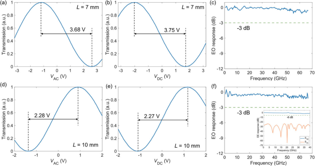 制备的s-sep和g-sep调制器其调制长度L分别为7毫米和10毫米。采用C波段可调谐激光器作为光源,并使用偏振控制器确保入射光处于TE偏振态。为验证施加于顶部电极的电信号能否通过绝缘SiO₂层形成的电容C1有效传输至T段实现调制,分别向s-sep和g-sep调制器施加相同频率为100kHz的中频三角电压信号至VDC和VAC端,并测量两种情况下半波电压Vπ。如图6a、b所示,s-sep调制器的交流电极与直流电极对应的Vπ值分别为3.68V和3.75V,对应的VπL值分别为2.576Vcm和2.625Vcm。对于g-sep调制器,如图6d、e所示,这两项数值分别为2.28V和2.27V,对应的VπL值分别为2.28Vcm和2.27Vcm。两种结构中顶部与底部电极测得的Vπ值基本一致,但测得的VπL值与1.9Vcm的模拟结果存在差异。这种差异很可能源于制造过程中的缺陷,例如过厚的包覆层或电极图案对准偏差。由于s-sep和g-sep器件是在不同的批次中制造的,也观察到某些差异。两种器件测得的消光比和插入损耗分别为≈30和1.15dB。还使用70GHz光探测器和矢量网络分析仪测量了制备调制器VAC电极上的电光频率响应。如图6c、f所示,两款调制器的3dB电光带宽均明显高于67GHz(受限于测量设备),在67GHz处仅出现1.2dB的滚降。电-电(EE)带宽同样远高于40GHz,在40GHz处仅出现2.1dB的滚降。基于上述测量结果,可得出结论:所提出的嵌入式电极设计不会影响TFLN调制器的调制性能。