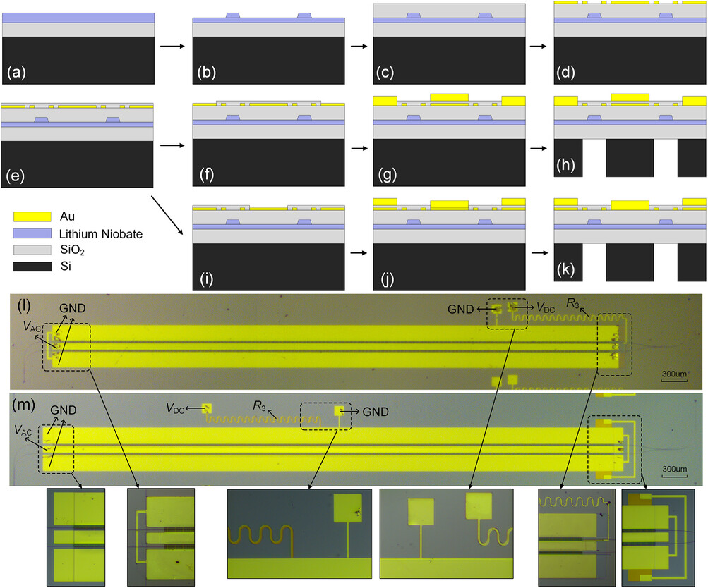 图5 所提TFLN调制器的制造工艺及最终器件图像。制造流程:a)LNOI晶圆,b)TFLN结构图案化,c)SiO₂包层沉积,d)T-segments与偏置电极金属薄膜沉积,e)绝缘SiO₂层沉积,f,i)绝缘SiO₂层蚀刻,g,j)顶部金属沉积,h,k)硅衬底背面孔蚀刻。f–h)对应s-sep结构,i–k)对应g-sep结构。l)s-sep与m)g-sep调制器的成品样品光学图像。蜿蜒的金属线作为芯片内电阻R3。图中同时展示了焊盘区域的放大图像。