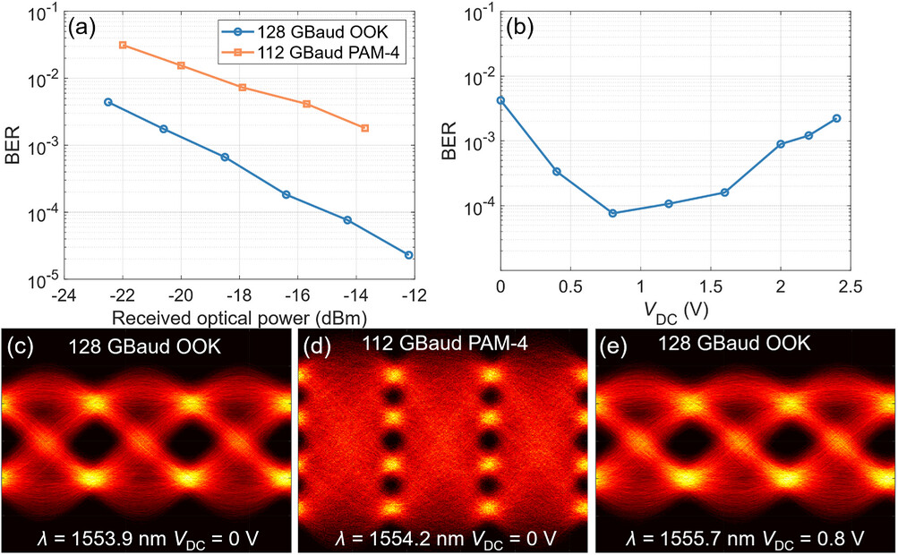 图8 s-sep调制器的数据传输测量。a)在(λ,VDC)=(1553.9nm,0V)和(1554.2nm,0V)条件下,128GBaud OOK信号与112GBaud PAM-4信号在不同接收光功率水平下的测量误码率(BER)。b)在λ=1555.7nm下,128GBaud OOK信号在不同VDC下的误码率。c–e)不同波特率及工作条件下测得的光眼图。