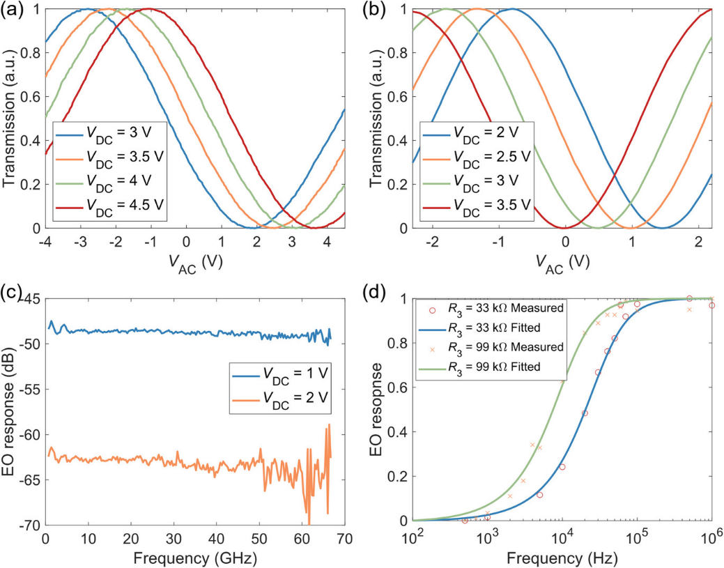 对器件的直流偏置特性进行了进一步表征。如图7a、b所示,交流电极由三角波信号驱动,而VDC则由不同直流信号驱动。可观察到,当VDC变化时,无论是s-sep还是g-sep结构,其输出光透射率均随之发生位移。在高频条件下,绝对电光响应也可如图7c所示,从象限点调谐至零点。上述结果证实调制器的偏置点确实由VDC改变。针对s-sep结构,我们在图7d中还测量了不同R3电阻值下低频和中频的电光响应。确实可获得高通响应特性,且R3值越高则截止频率越低,这与图3a讨论的仿真结果相吻合。