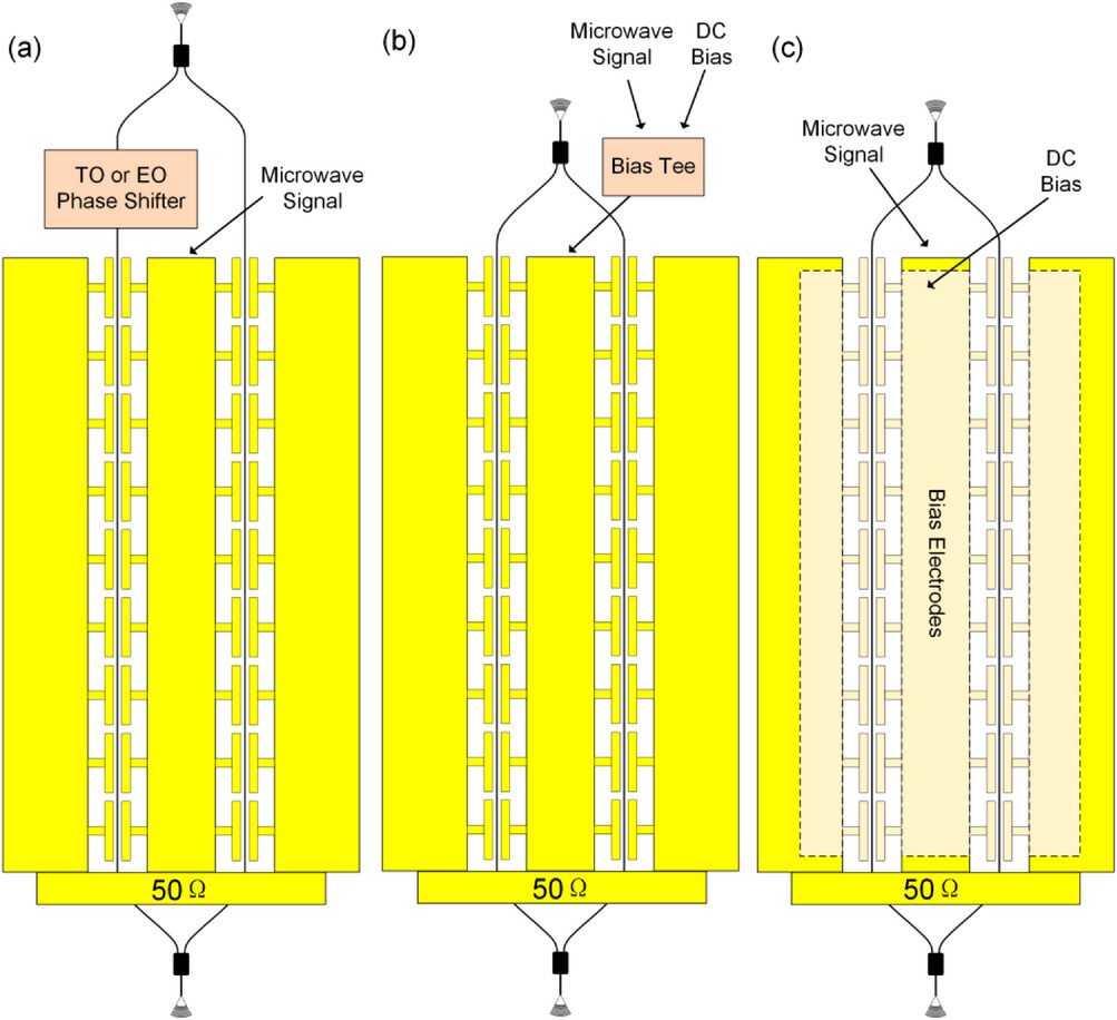 图1 偏置TFLN MZM的不同方案。a)使用额外的TO或EO相位移位器。b)使用bias tee同时发射微波信号和直流偏置。c)提出的直流偏置嵌入式电极设计。