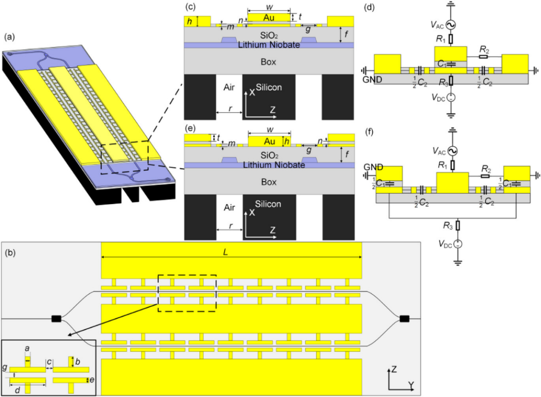 图2 所提直流偏置嵌入式TFLN电光调制器的详细结构。a)整体结构的三维视图。b)电极区域的顶视图。c)s-sep结构的截面图及d)等效电路。e)g-sep结构的截面图及f)等效电路。