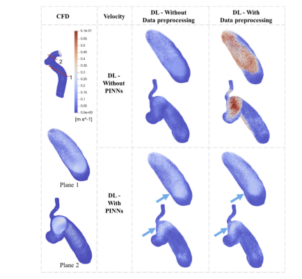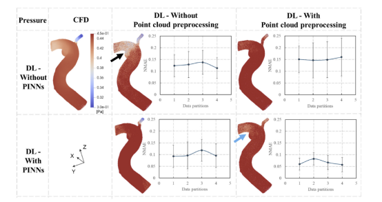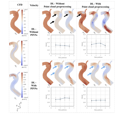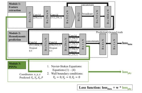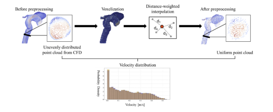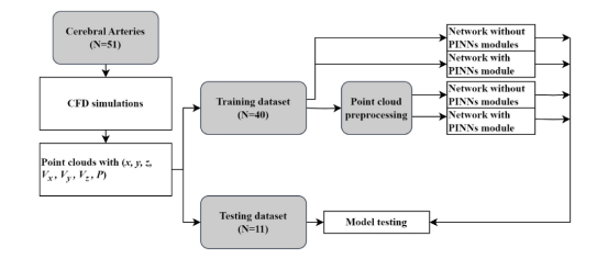 并设计了一种新型神经网络架构,以提升在有限患者数据集下的学习性能。该预处理策略通过应用体素化和距离加权插值等重采样技术,确保点云的空间均匀性,从而优化从计算流体动力学(CFD)获得的数据,使其更适于AI模型的训练。同时,引入物理信息神经网络(PINNs)模块,使网络从完全数据驱动逐步过渡到半数据驱动的框架,有效降低对数据的依赖性。