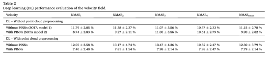 图6. CFD与深度学习(DL)预测结果的可视化对比,包括无点云预处理和有点云预处理两种情况,以及是否引入PINNs模块时的速度分量Vx、Vy、Vz的差异。