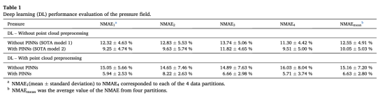 图5. CFD与深度学习(DL)预测结果的可视化对比,分别展示了无点云预处理和有点云预处理两种情况下的压力P分布,以及是否引入PINNs模块的对比。数值已通过数据集内的最大值和最小值进行归一化处理。