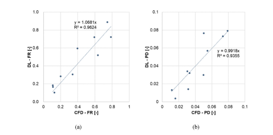 图9. 经CFD和深度学习(DL)模型预测的动脉瘤颈部血流比(a)(FR)及压力差(b)(PD),其中采用了点云预处理和PINNs模块。