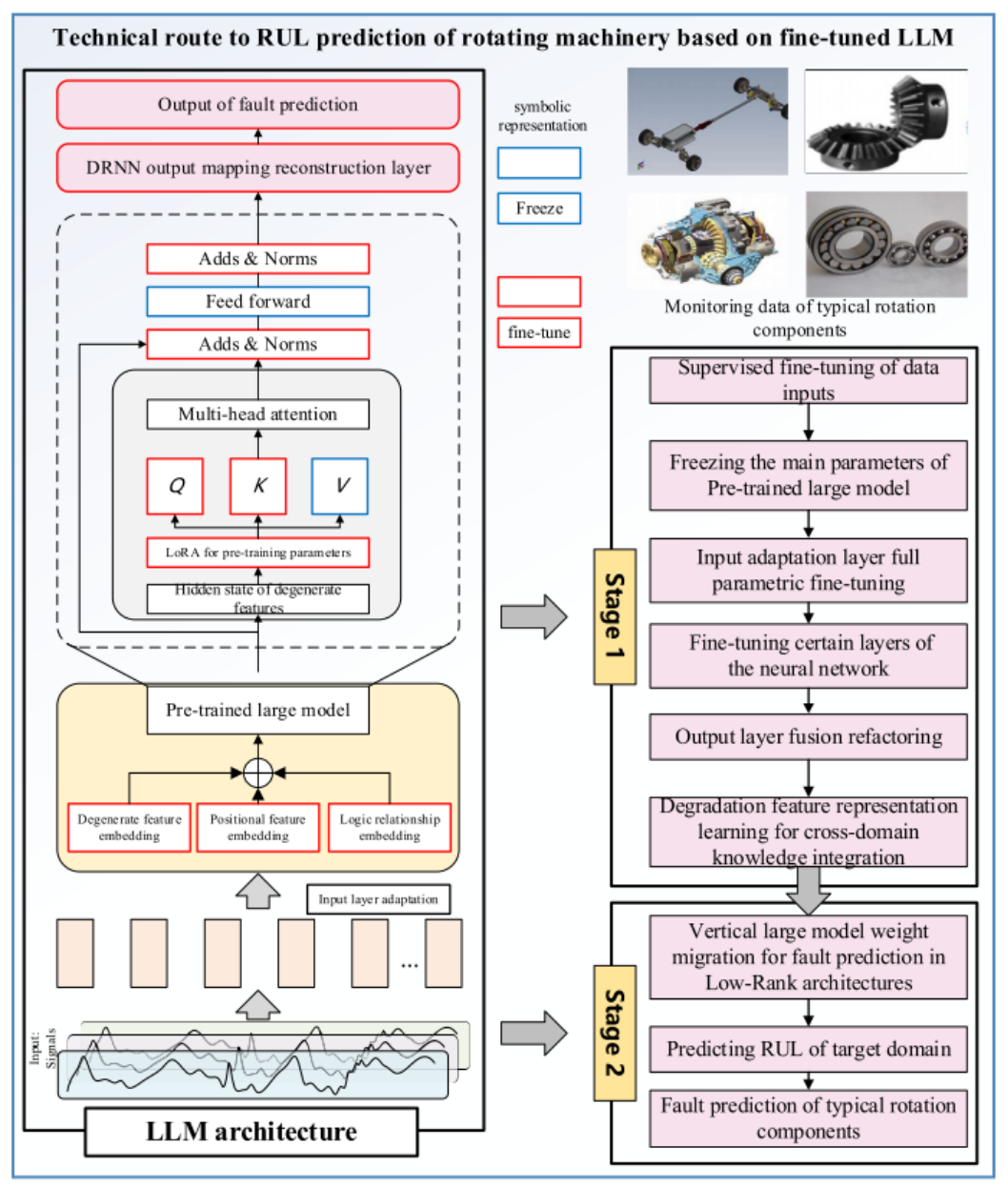 为验证所提出范式一的有效性,我们开展了基于大语言模型的旋转机械剩余使用寿命预测案例研究,如图4.19所示。本研究旨在利用旋转机械寿命退化数据集,结合经典可靠的精调方法,使开源大语言模型能够适配该预测任务。通过该方法,大语言模型在保持其学习与推理能力的同时,可实现对旋转机械振动数据的分析并输出准确的剩余使用寿命预测值。