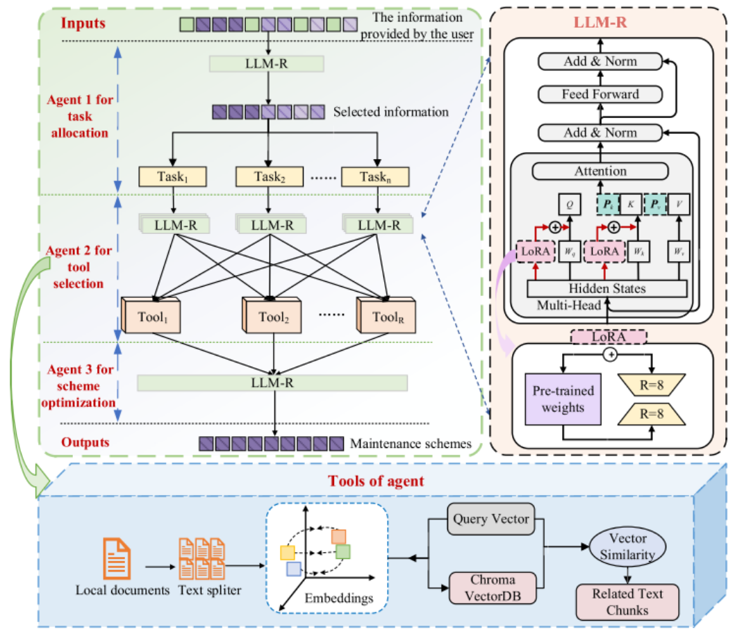 为验证该方法的实际效果,我们聚焦于维护方案生成任务。通过混合数据的监督微调,增强大语言模型在垂直维护领域的适应性,并创新性引入任务级智能体与指令级检索增强生成技术,以优化维护方案生成流程并减少幻觉现象。其架构如图4.20所示:用户输入维护需求后,LLM-R首先进行相关信息过滤;随后由智能体1执行任务解析与选择;智能体2负责工具调用与信息检索;最终由智能体3完成维护方案的优化生成。在技术实现层面,我们选择R=8的参数进行模型精调,构建了专业维护方案数据集,并以航空与海事维护典型场景作为测试案例,验证LLM-R在复杂任务环境下生成智能维护方案的能力。