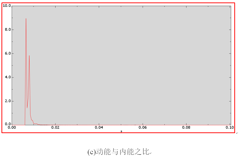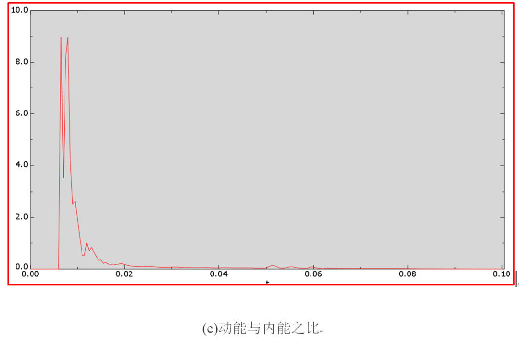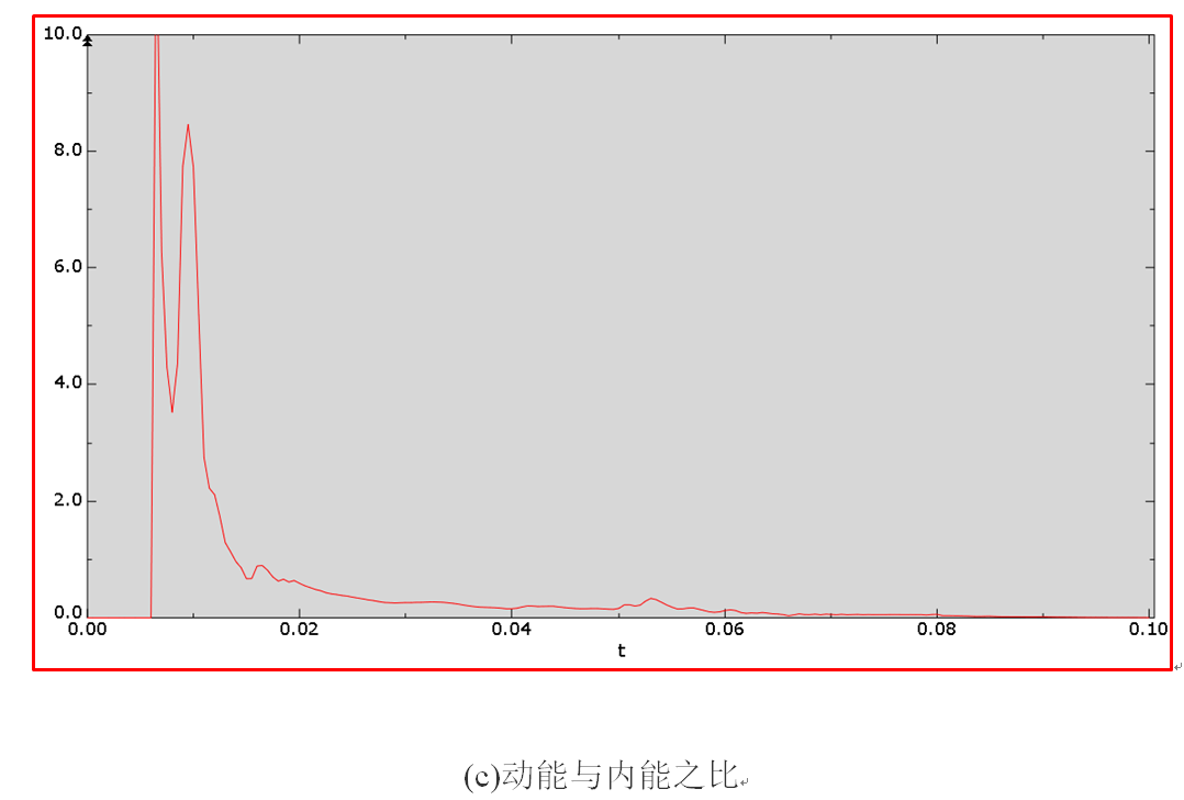 为了丰富比较样本,把质量放大25倍后再计算一次。监测计算过程,稳定时间增量为1.51e-6s,总共计算时间为61s,提取应力、等效塑性应变、动能与内能之比,见图14。