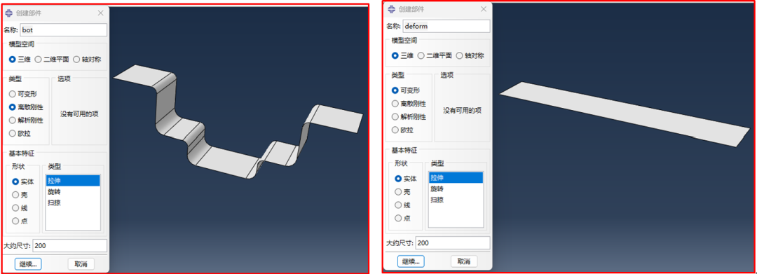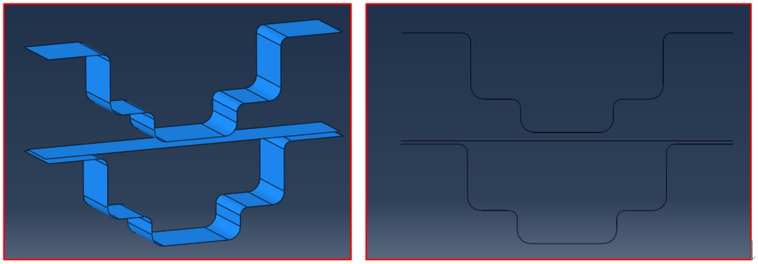 由于分析目标是坯料在冲压过程中的状态变化,模具受力状态并不是我们关系的重点。因此上、下模具使用离散刚体建模,坯料使用可变形建模,见图2。