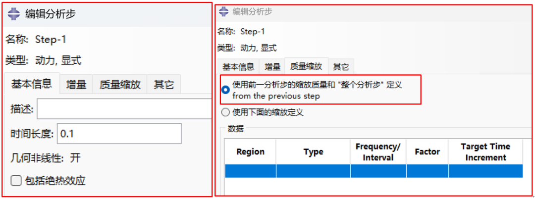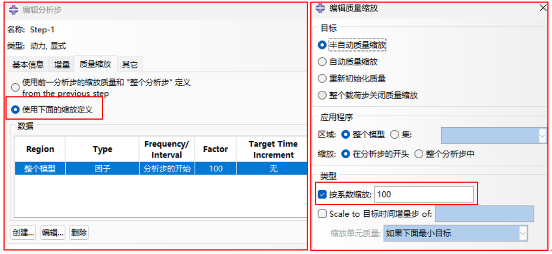 在分析步模块中,设置质量缩放参数为100,其余按默认设置,见图12。