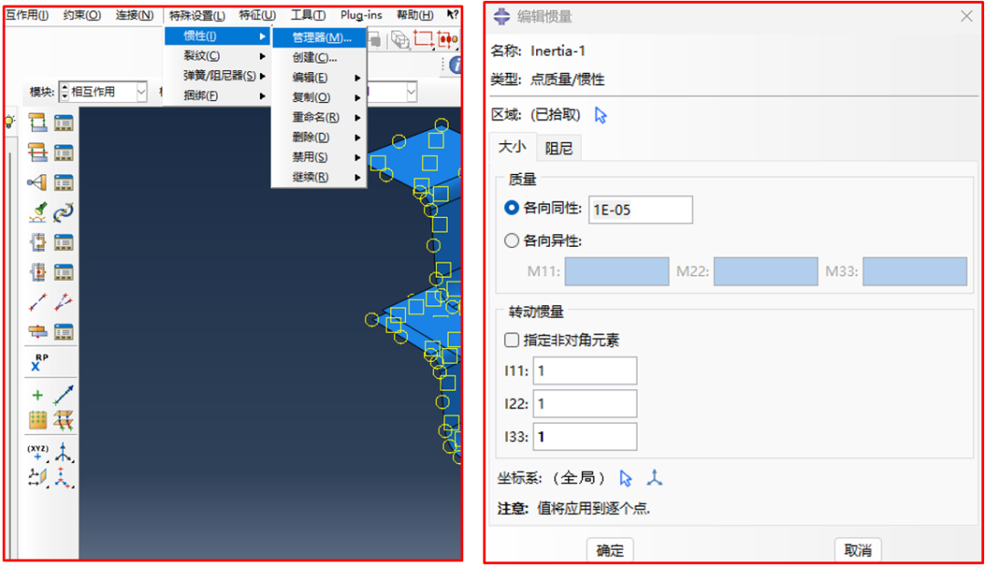 由于离散刚体没有赋予材料,因此它是无质量物体,在动力学分析中,还需要设置其质量、惯量,见图6所示。
