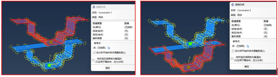 为了方便施加载荷,使用“刚体约束”把两个离散刚体与其参考点连接起来,见图5。