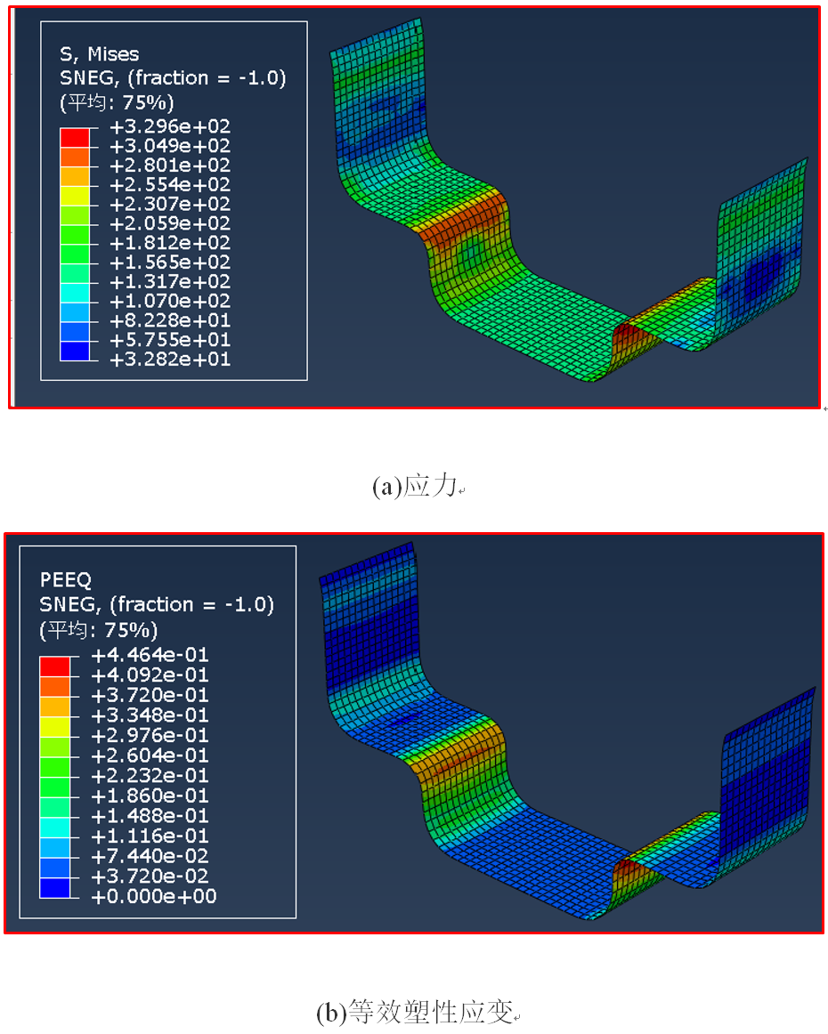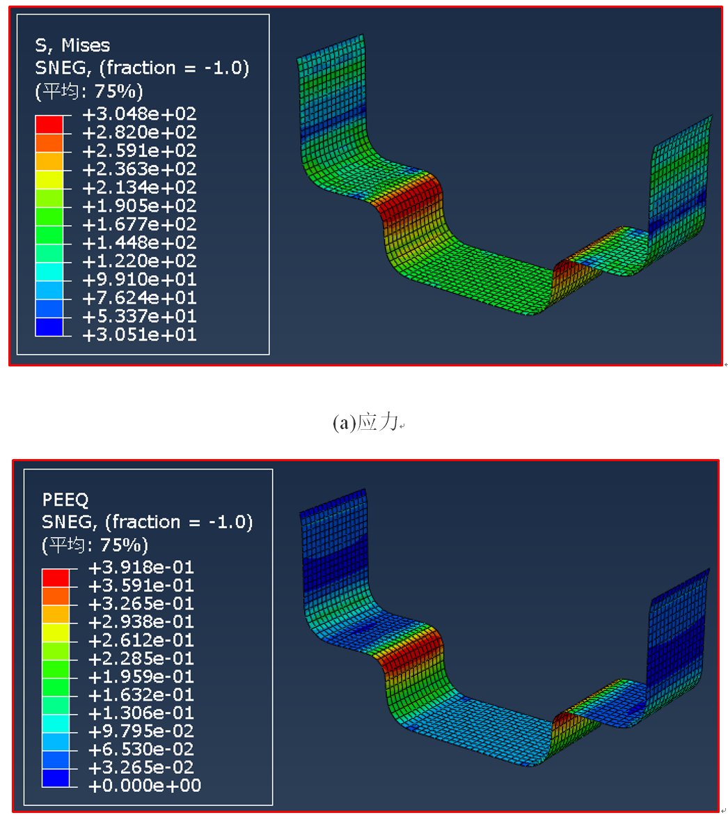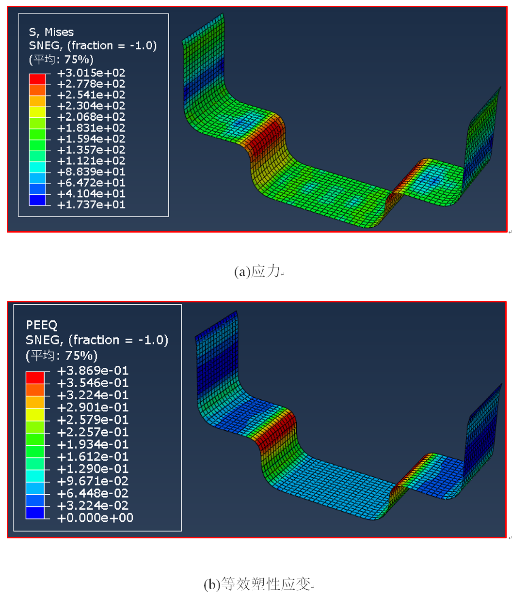 监测计算过程,稳定时间增量为3.02e-7s,总共计算时间为296s,提取应力、等效塑性应变、动能与内能之比,见图11。除了模具与坯料的短暂接触过程,其余时间段,动能都远远小于内能。
