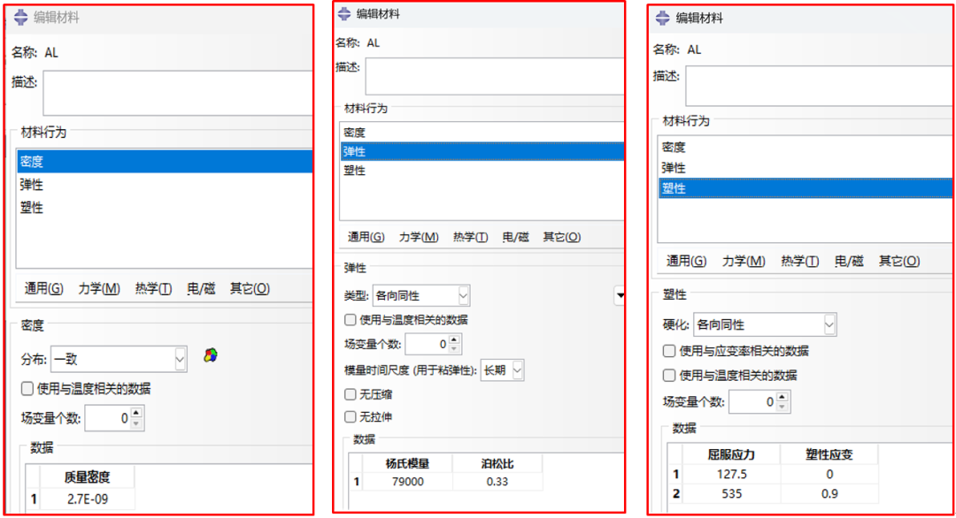 由于上、下模具都是离散刚体,无需赋予材料,只需给坯料赋材料,分别设置铝的密度、弹性、塑性参数,见图3。