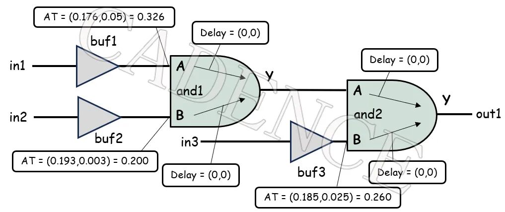 为了更直观的作 bounded 运算,我们将 and1 和 and2 的延迟都设为(0, 0),也就是说可以直接将 in1, in2, in3 至 and1/A, and1/B, and2/B 的到达时间用来判断 nworst 到达时间为哪条路径。由上图所标示的 nsigma 到达时间可以知道,最差路径为 Path1,Path3 次之,最后是 Path2。