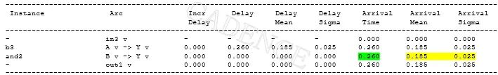 但是当用户定义了路径的起始点为 in1, report_timing -from in1 -to out1 则会报出经过in1->b1->and1/A->and1/B 的到达时间,与上方看到的 mean/sigma 都不一样: