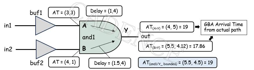 在统计学分析下,在定义到达时间最差情况上会遇到一些问题。以下图为例,与门输出端 (and/Y) 最差的到达时间均值是来自 B -> Y 而标准差则是来自 A -> Y。不论单独以均值或标准差作为判断标准都会有不足的地方。
