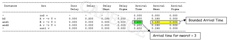 当考虑最差路径时,它会考虑所有相关路径上的多输入单元,进行保持最差操作,所以在这个例子中,最差的到达时间均值为 in2 -> b2 -> and1/B ,bounded 的到达时间均值将会使用 Path2 的到达时间均值 0.192,而 nsigma 则来自于in1-> out1 的0.326
