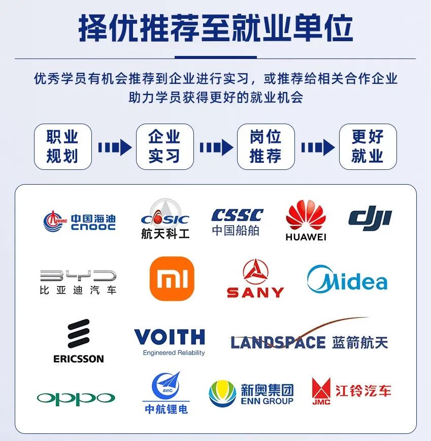 :优秀学员将获得宝贵的100+名企岗位内推机会。我们已帮助众多学员成功进入华为、航天科工、格力、美的等行业头部企业。