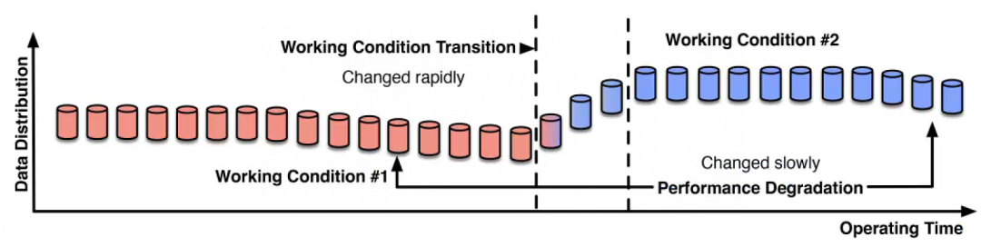 机械故障诊断具有重要的实际意义[150]。机械系统中的故障可能导致严重的安全隐患,对操作人员的人身安全构成威胁。此外,它们可能导致生产过程中断,对产品质量产生负面影响。机械系统通常包括轴承、齿轮箱、转子和泵等关键部件[54],[151]。这些系统通常配备大量传感器,能够收集高频数据,如振动、温度、压力和转速[152]。高采样率与先进特征提取技术的结合能够及时反映系统的运行状态。尽管有这些能力,在设计有效的诊断模型方面仍然存在若干挑战。 性能退化 是机械系统故障诊断中的一个关键问题,因为它直接影响离线阶段开发的评估方法的有效性[153]。随着时间的推移,系统部件应力和结构的变化可能导致功能故障,而退化过程通常是复杂且高度不可预测的。如图9所示,性能退化通常表现为监控数据分布的逐渐和连续变化。这些挑战凸显了在线操作期间诊断模型有效部署和持续适应的必要性。在这方面, 增量在线学习方法 具有更强的适应性,特别适合解决性能退化问题[55]。例如,He等人[55]提出了一种基于增量自适应更新的FD方案,在XJTU-SY轴承数据集的不同运行条件下达到了高达99.6%的准确率,这证明了增量学习在不断发展的工业环境中保持可靠诊断性能的实际优势。