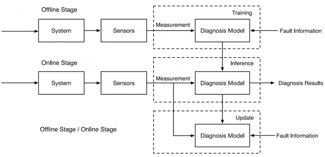 其中 和 分别表示 中的第 个实例及其故障模式。 通常,诊断模型 可以在离线阶段构建,表示为: