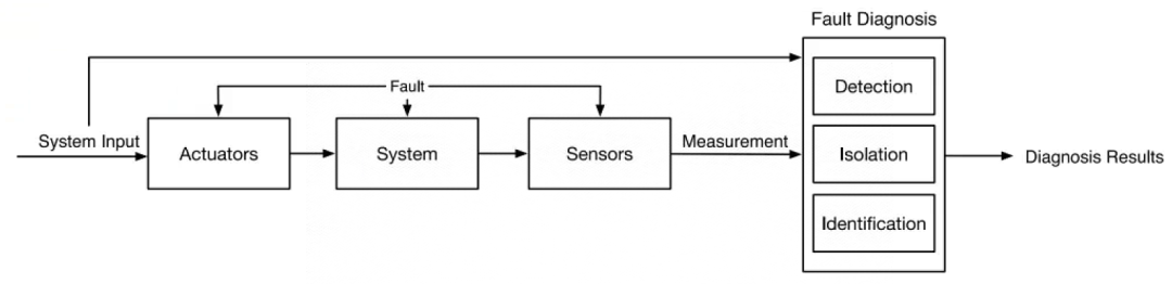 动态系统的故障诊断技术是提高系统可靠性和降低事故风险的关键方法。根据国际自动控制联合会(IFAC)认可的官方声明,故障被定义为系统的至少一个特征属性或参数偏离可接受/通常/标准条件的未被允许的偏差[26]。传统上,一个全面的故障诊断过程必须包括在动态系统内进行故障检测、故障隔离和故障识别的任务,这可描述为[27]和[28]: