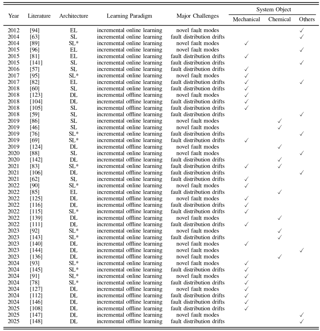 ● 系统对象(System Objects) :ILFD的应用在近年来显著多样化。最初,增量学习方法主要应用于机械系统的故障模式识别。随着研究的进展,其范围逐渐扩展到包括化学和其他复杂系统。此外,工业互联网和智能制造的快速发展推动了这些方法从组件级应用转向系统级应用。相关技术越来越期望整合来自各种来源和维度的数据,从而能够处理更复杂的故障模式,特别是那些与复杂交互和多因素影响引起的系统故障相关的模式。