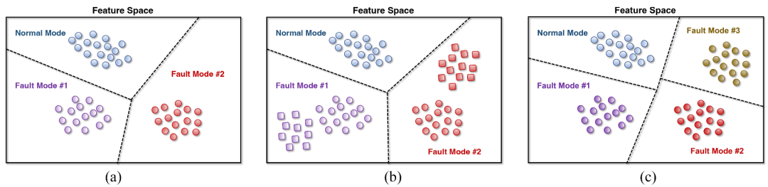 图6 概念图展示了特征空间中的故障分布漂移及新型故障模式。虚线表示决策边界 (a)原始诊断任务 (b)故障分布漂移 (c)新型故障模式