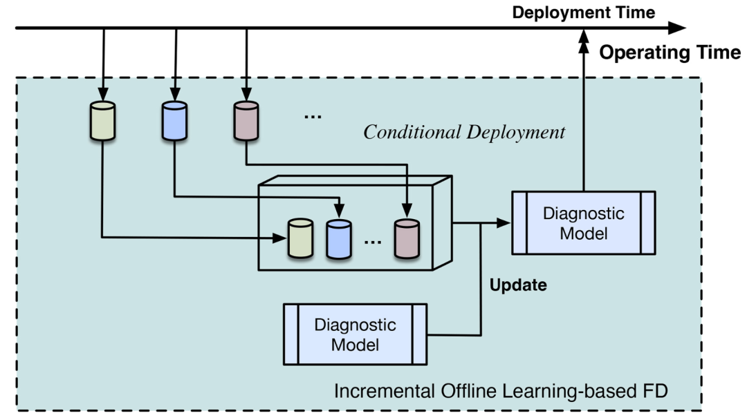 与第4节提到的基于增量在线学习的FD方法不同,一些方法旨在积累足够丰富的历史数据后,在离线阶段增量更新模型。该技术思路也很直观。如果发生故障分布漂移,更新后的模型可以有效地执行诊断任务,从而在一定程度上解决性能下降和多工况故障诊断等问题。