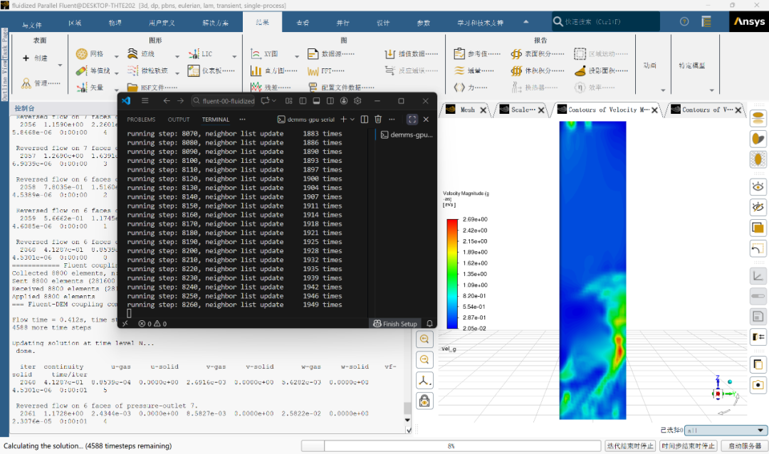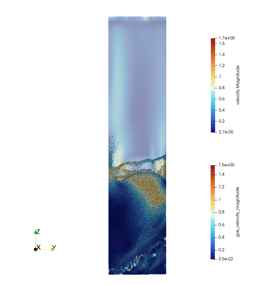 通过CFD–DEM耦合,可以实现流体域中求解流场,同时在颗粒域中计算颗粒的受力与运动状态,实现气–固两相的协同演化模拟。