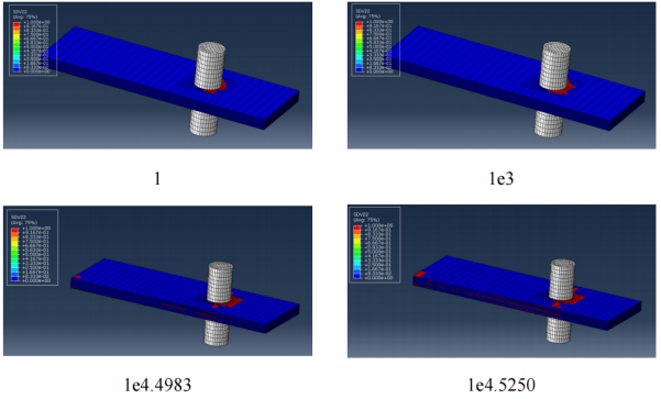 疲劳次数从1e4.4983增加到1e4.5250后,失效区域迅速扩展到多层,以加速扩展前的疲劳循环次数1e4.4983作为疲劳寿命。