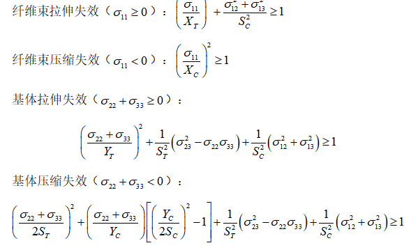 材料性能慢慢下降,迟早会破坏,所以再加个失效判据准则,这里用Hashin准则(当然还可以加上判断分层的):